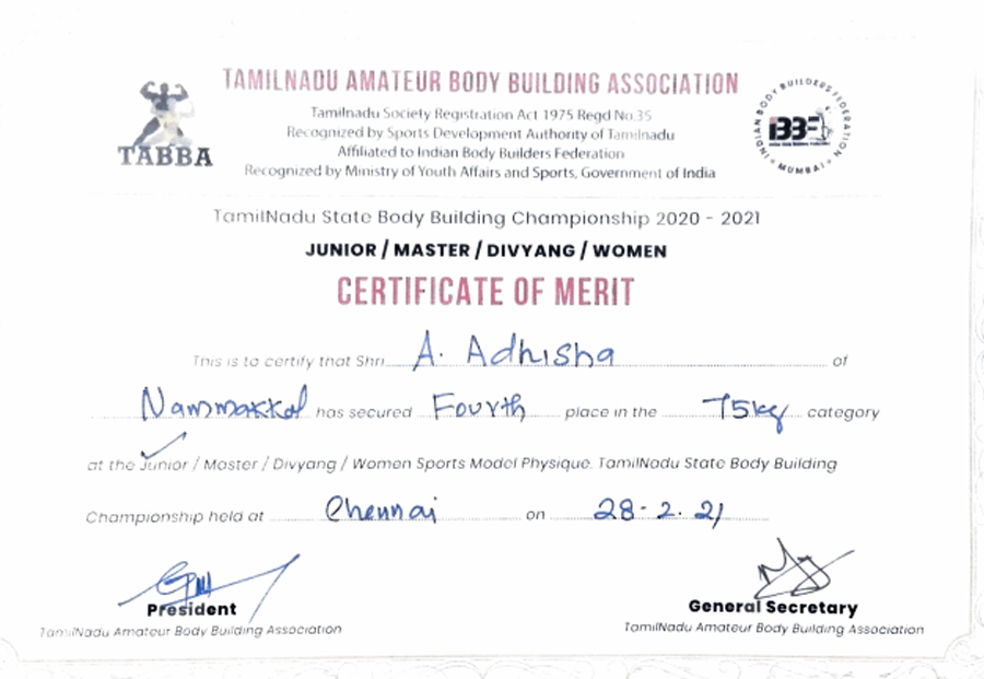 S.Adhisha from second year ECE awarded as “Jr.Mr.Tamilnadu” under the category of 75kg, from TamilnaduAmatuer Body Building Association on 28.02.2021.
