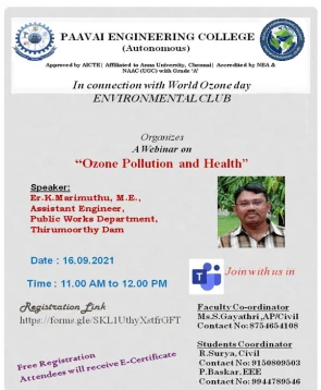 | 2 | 16.09.2021 | Webinar | Er.K.Marimuthu, M.E., Assistant Engineer, Public Works Department, Thirumoorthy DamEvent coordinators: Ms.S.Gayathri,AP/Civil | Ozone Pollution and Health Issues | View |