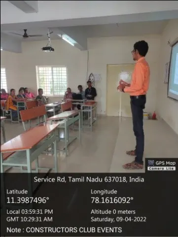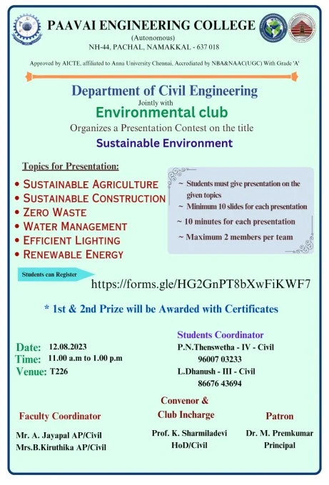 | 2 | 05.08.2023 | Club Event | Internal Jury: Prof.K.Sharmiladevi HoD/Civil Paavai Engineering College Event coordinators: Mr.A.Jayapal,AP/Civil Mrs.B.Kiruthika,AP/Civil | Presentaion on ‘Sustainable Environment’ | View |