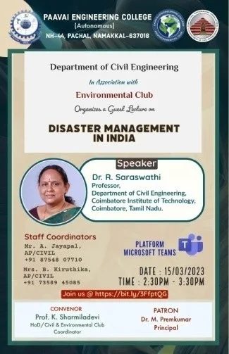 | 1 | 15.03.2023 | Guest Lecture | Dr.R.Saraswathi Professor Department of Civil Engineering, Coimbatore Institute of Technology, CoimbatoreEvent coordinators: Mr.A.Jayapal,AP/Civil Mrs.B.Kiruthika,AP/Civil | Disaster Management in India | View |