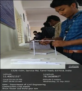 | 4 | 21.09.2022 | Non Technical event | Convenor: Prof.K.Sharmiladevi, HoD/Civil Event Coordinators Mr.N.Moorthi,AP/Civil Ms.S.Gayathri,AP/Civil | Brain Teaser and Build your own | View |
