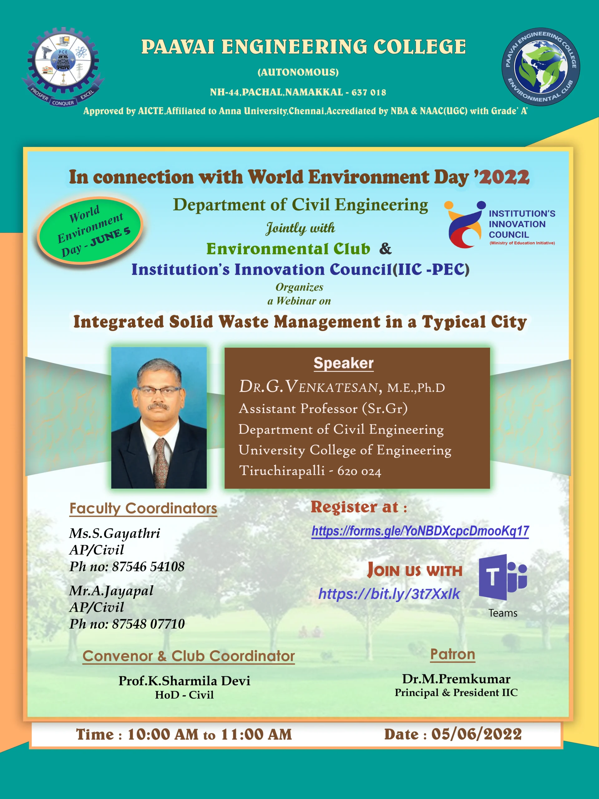 | 1 | 05.06.2022 | Webinar | Dr.G.Venkatesan, M.E., Ph.D., Assistant Professor (Senior Grade), Department of Civil Engineering, University College of Engineering, TrichyEvent coordinators: Mr.A.Jayapal,AP/Civil Ms.S.Gayathri,AP/Civil | Integrated Solid Waste Management in a Typical City | View |