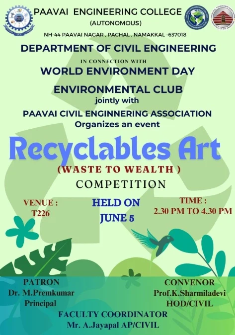 | 2 | 05.06.2024 | Competition | Internal Jury: Prof.K.Sharmiladevi HoD/Civil Paavai Engineering CollegeEvent coordinators: Mrs.S.Rajeswari, AP/Civil Mr.A.Jayapal,AP/Civil | Recyclables Art and Logo Competition | View |