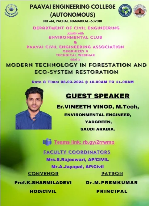 | 1 | 08.03.2024 | Webinar | Er.Vineeth Vinod, Environment Engineer, Saudi Arabia.Event coordinators: Mrs.S.Rajeswari, AP/Civil Mr.A.Jayapal,AP/Civil | Modern Technology in Forestation and Eco-System Restoration | View |