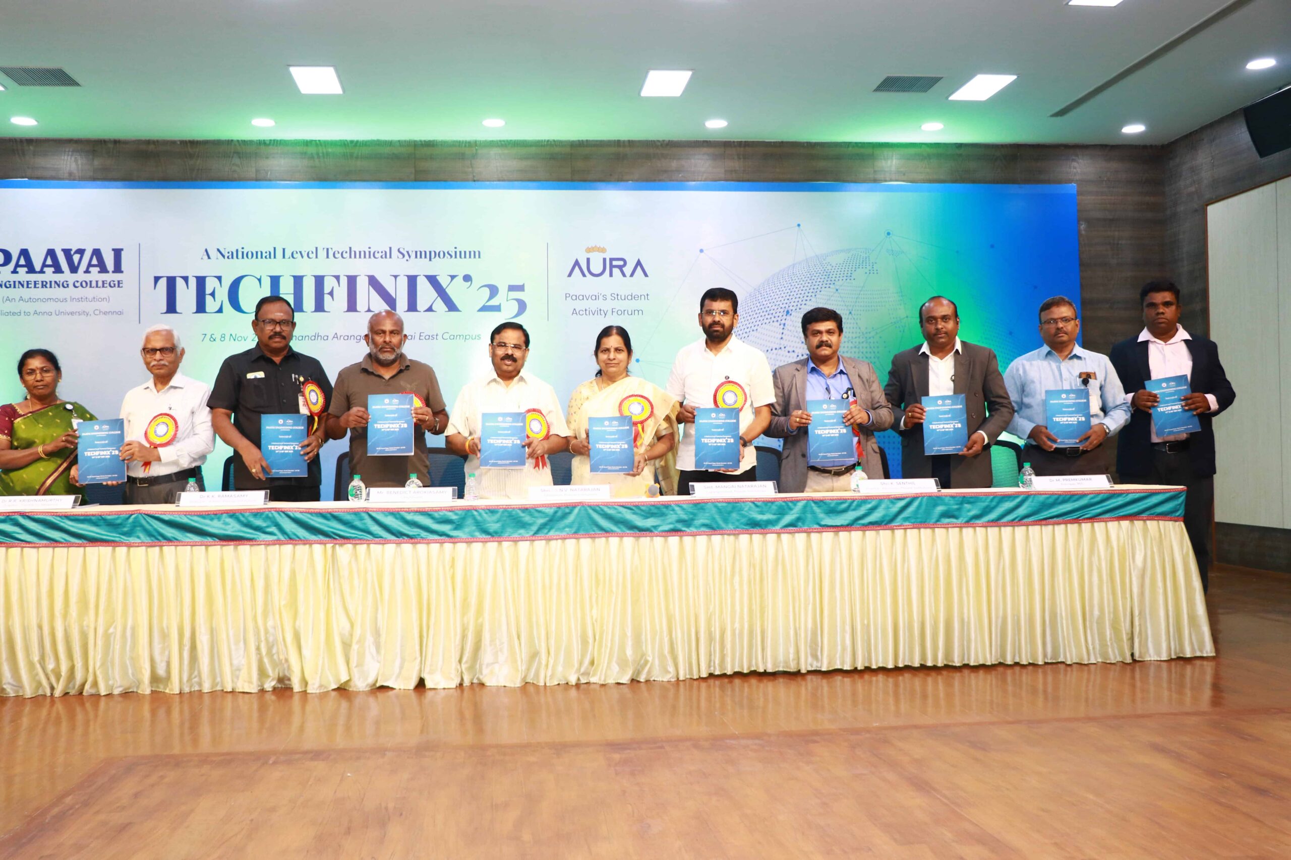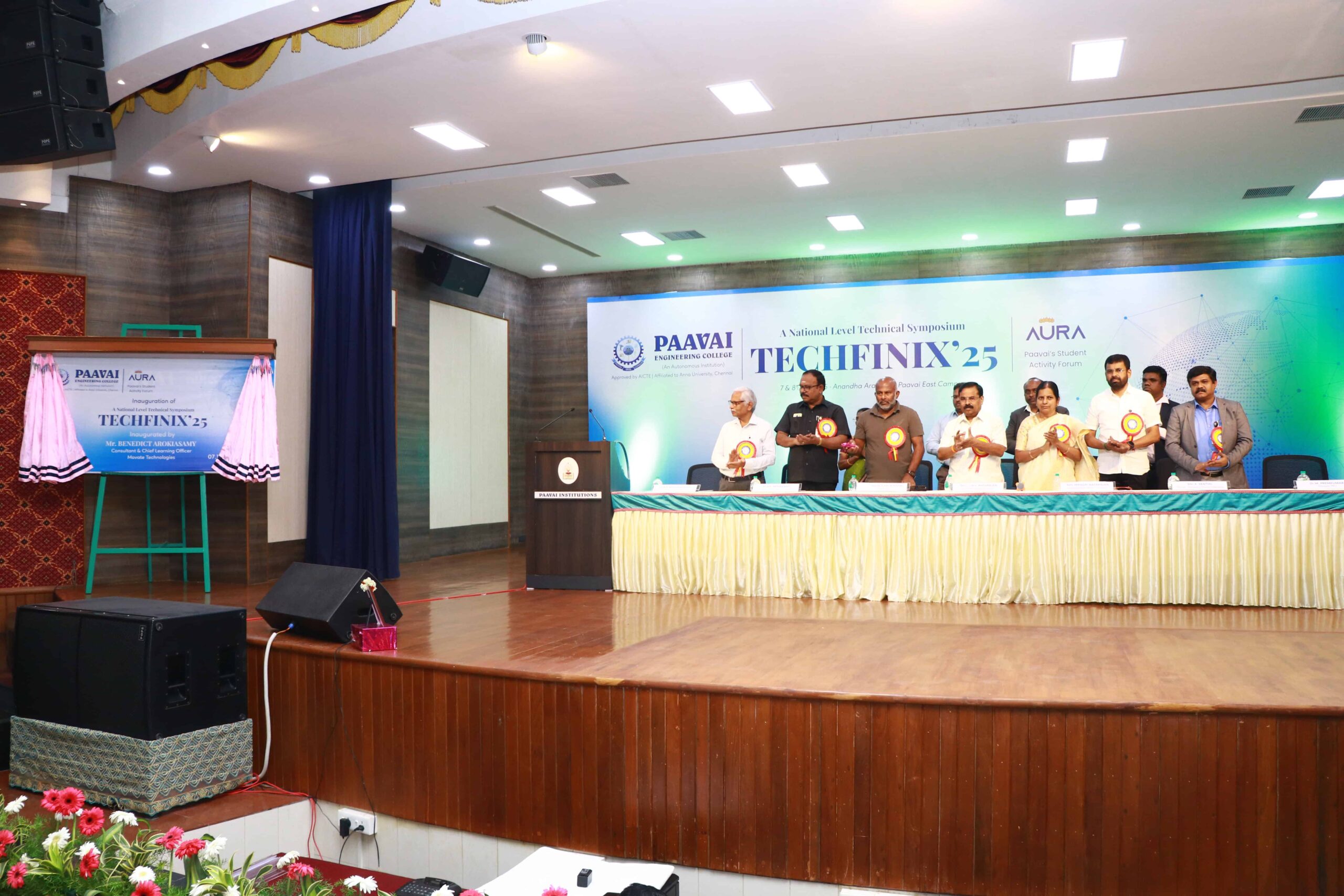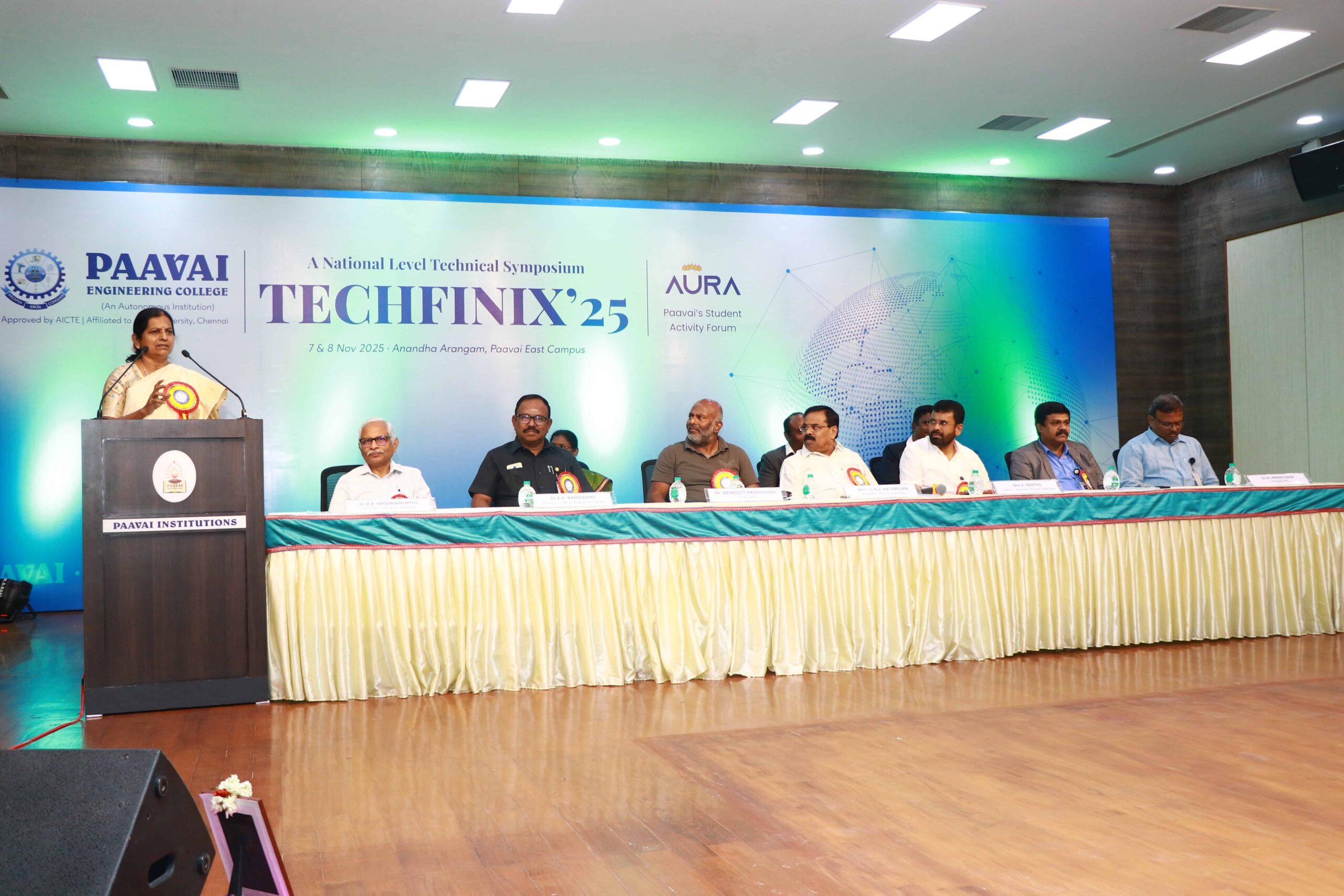 Paavai Engineering College hosted a two-day National Level Technical Symposium, TECHFINIX’25, on 07.11.2025 and 08.11.2025 at Anandha Arangam. The inaugural session commenced with an invocation, followed by Tamil Thai Vazhthu. Smt. Mangai Natarajan, Correspondent of Paavai Institutions, lit the kuthuvilakku along with other dignitaries.