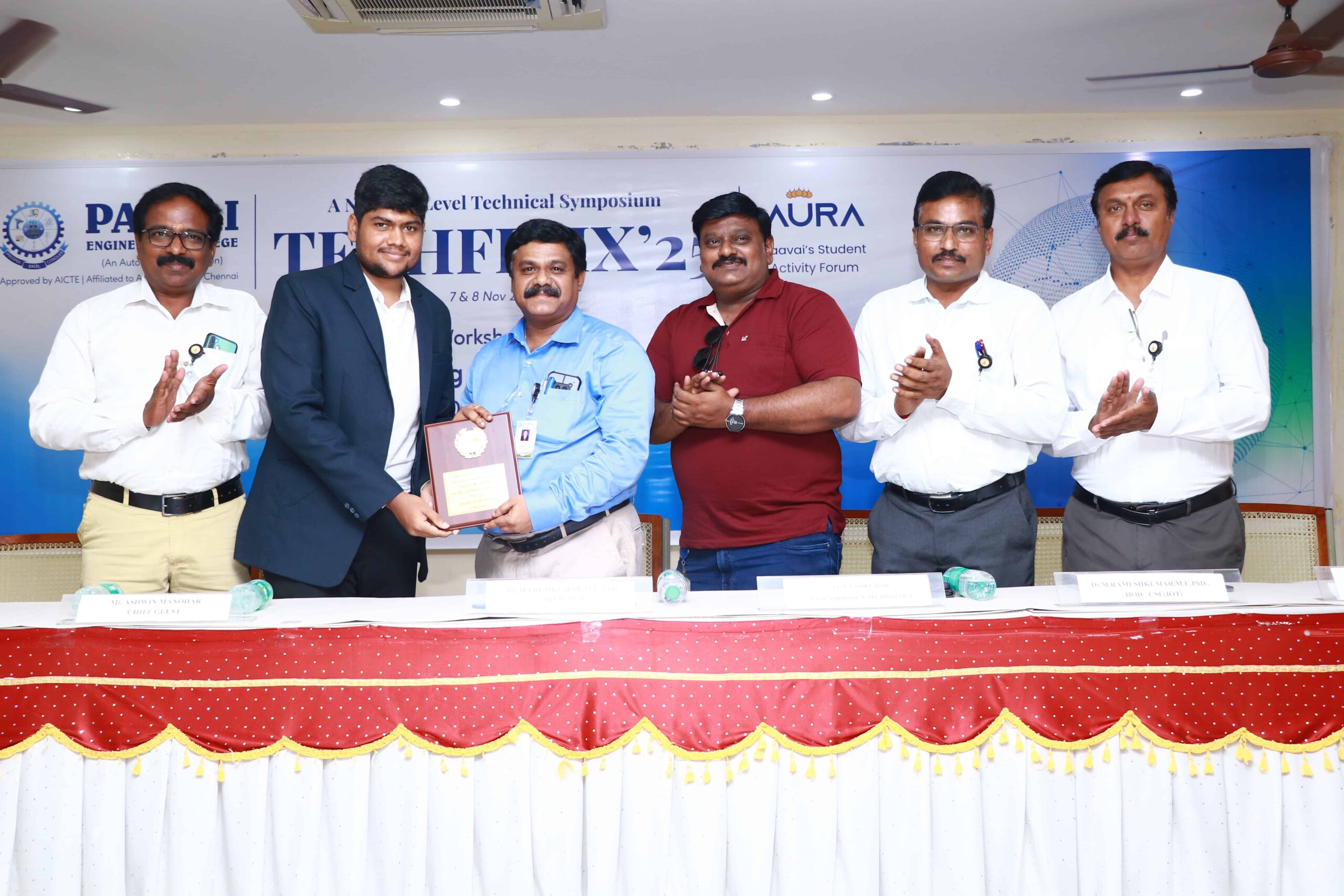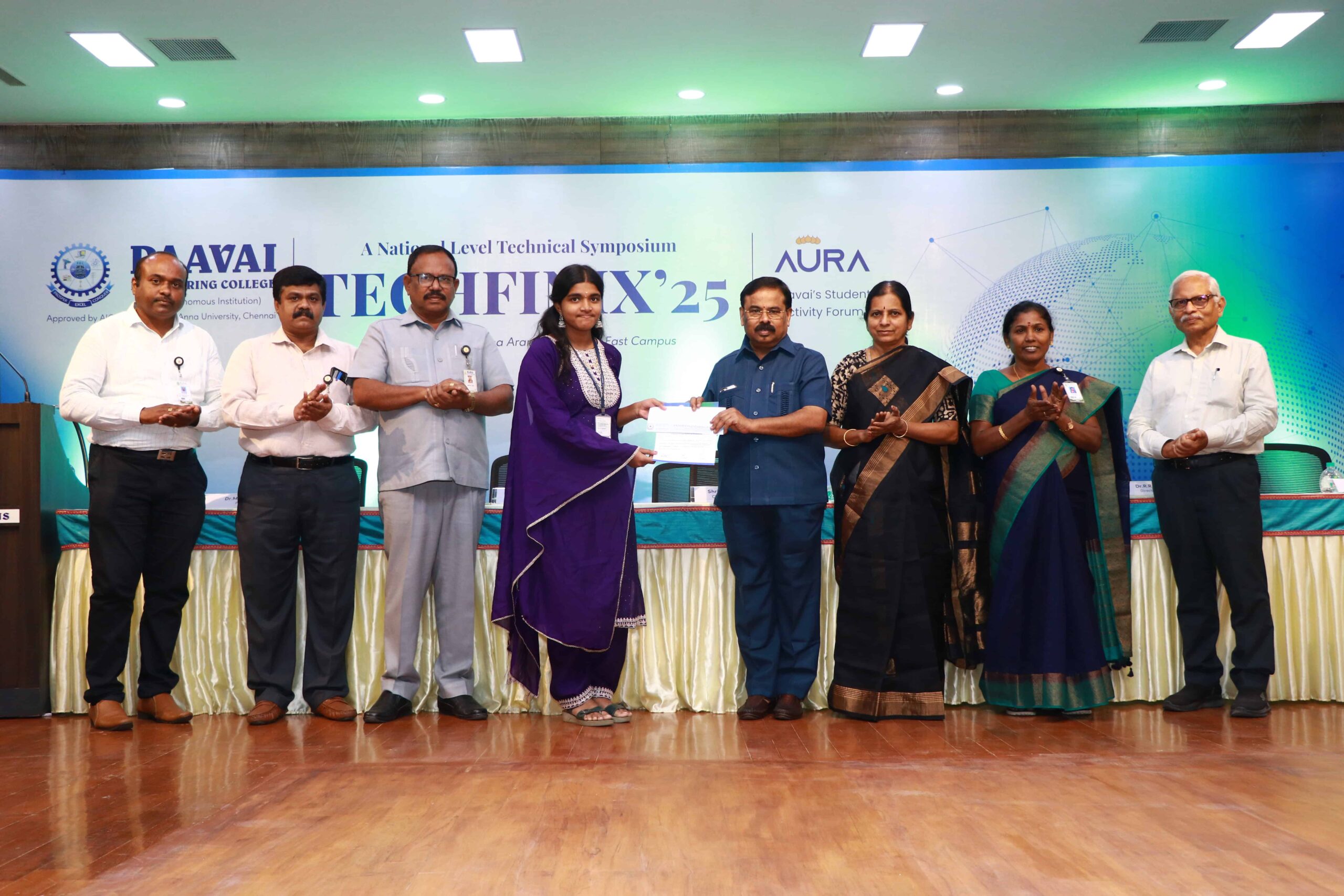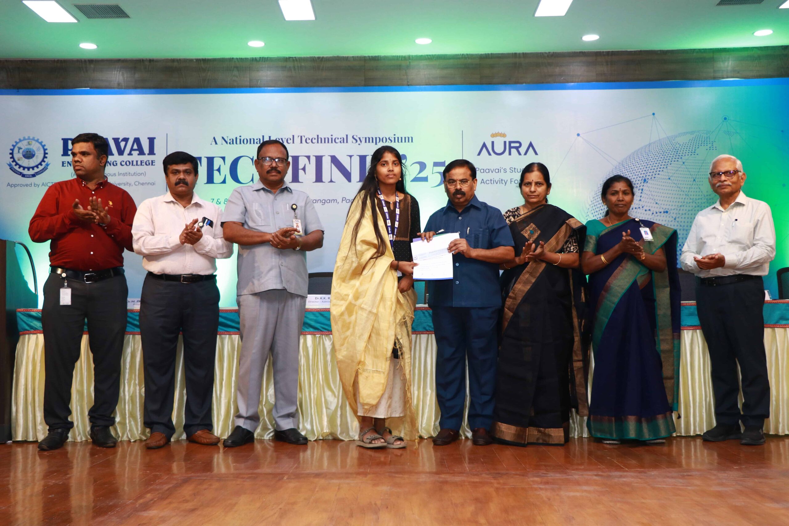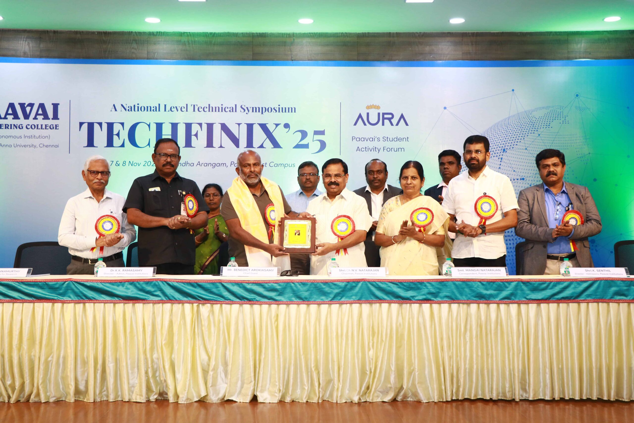 Paavai Engineering College hosted a two-day National Level Technical Symposium, TECHFINIX’25, on 07.11.2025 and 08.11.2025 at Anandha Arangam. The inaugural session commenced with an invocation, followed by Tamil Thai Vazhthu. Smt. Mangai Natarajan, Correspondent of Paavai Institutions, lit the kuthuvilakku along with other dignitaries.