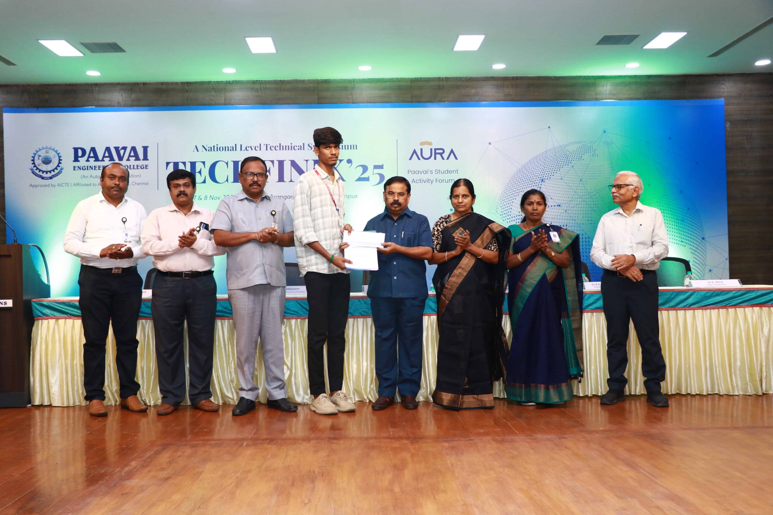 The event was attended by the Director of Admissions, Director of Administration, Director of Research, Principals, Deans, Controller of Examinations, Conveners of TECHFINIX’25, Heads of various Departments, faculty members, students of Paavai Engineering College, jury members, and participants from various colleges.