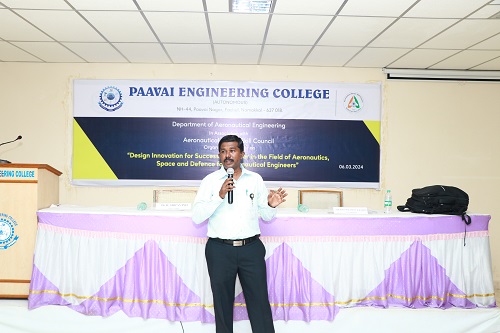 A Seminar on the topic “Design innovation for successful career in the fields of Aeronautics, Space and Defence for Aeronautical Engineers” was organized by the Department of Aeronautical Engineering in association with Aeronautical Sector Skill council on 06/03/2024 from 10.30 AM To 01.00 PM. Mr.Dhanish Abdul Khader, Space system Engineer (Analytics), SS Technologies, Banglore was the Guest Speaker. The aim of the event was to introduce students to the latest career advancements in software within the realms of Aeronautics, Space, and Defence, specifically targeting Aeronautical Engineers, along with the corresponding array of career opportunities available. The Welcome address and chief guest introduction was delivered by R.Yuvaraj, student of Final Year Aeronautical Engineering. Dr. M. PREMKUMAR, Principal of Paavai Engineering College encouraged the students to look beyond the syllabus to improve the knowledge and thank the resource person for the valuable inputs.