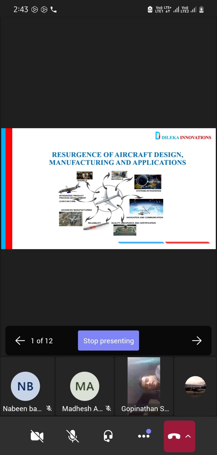 An Alumni Guest Lecture on the topic “Resurgence of Aircraft Design, Manufacturing and Applications” was organized through online by the Department of Aeronautical Engineering on 18/05/2024 from 02.00 PM To 04.00 PM online. Gopinathan Selvam, Founder and Director, Dileka Aerospace Pvt Ltd and Dileka Innovations, Nilgris-643217 was the Guest Speaker. The objective of the event was to familiarize about the career opportunities in the field of aeronautics, aerospace and defense. They will also know about the various skills demanded by the Industries. The Welcome address and chief guest introduction was delivered by Mr.Perikala Akilesh, student of Third Year Aeronautical Engineering.