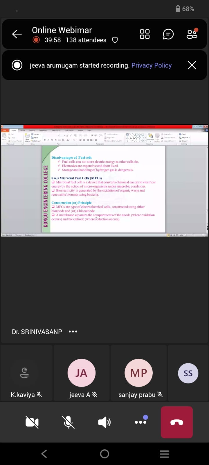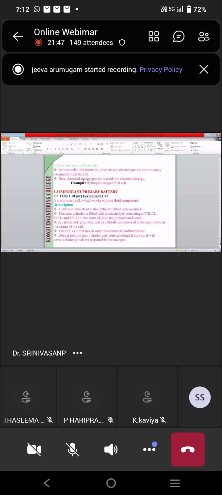 The Department of chemistry was organized an online Guest Lecture about ” INNIVATIVE SOLUTIONS FOR ENERGY STORAGE ” on 09th May 2024 at 06.30 p.m. through the Microsoft Teams platform. The Resource person was Dr.P.Srinivasan, Associate Professor, Kongu Engineering College, Perundurai. The welcome address was given by Mr.A.Jeeva AP /Chemistry and the resource person was introduced by Mrs.S.Sathiyasudha, AP/Chemistry.