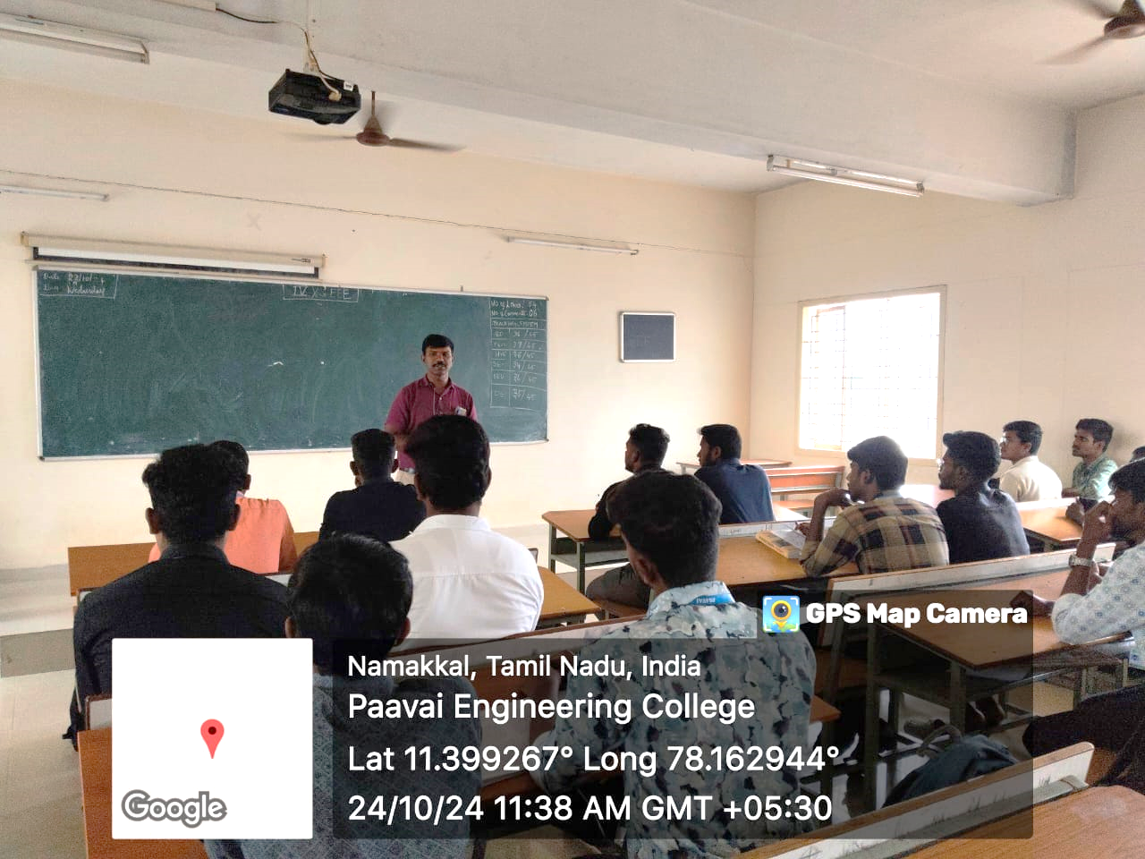 The session was attended by the Head of the Department, faculty members, and students. The vote of thanks was delivered by M. Kavipriya, a fourth-year EEE student. Dr. G. Balaji, Professor and Head of the EEE Department, along with Mr. R. Satheeshkumar, Assistant Professor of EEE, handled the necessary arrangements for organizing the program. The role of master of ceremonies was managed by S. Naveenkumar, a fourth-year EEE student.