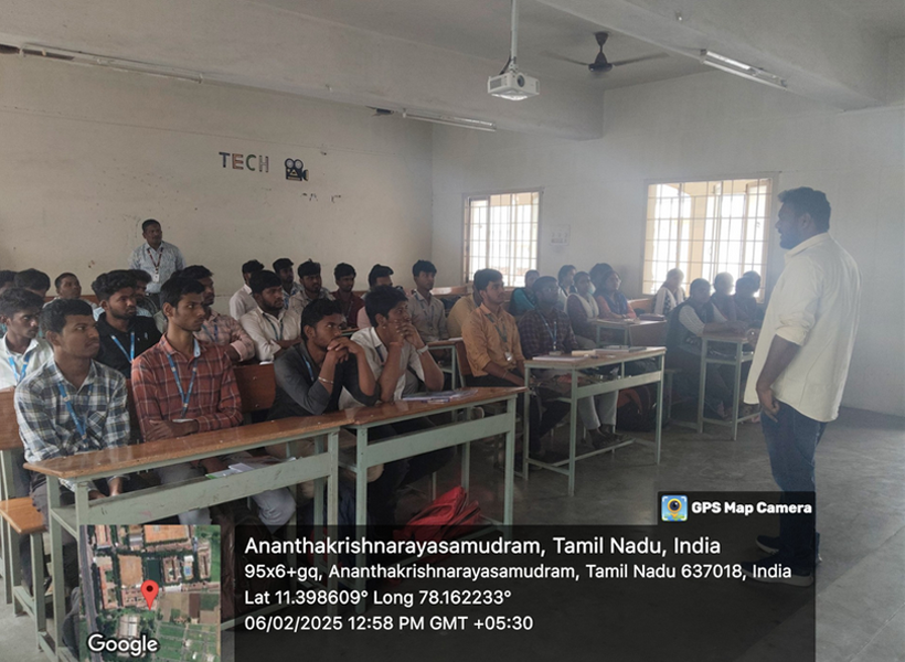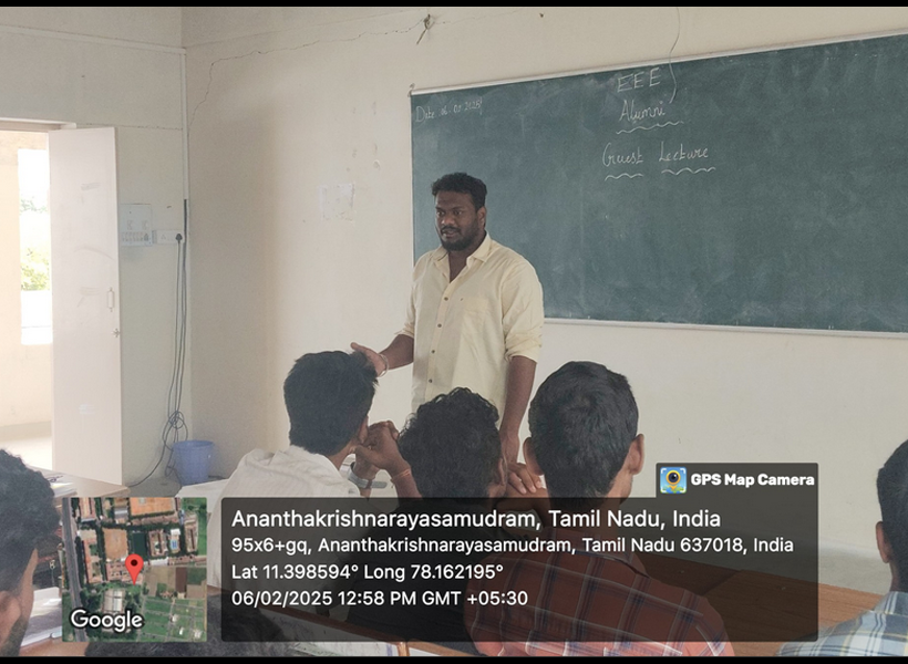 The Department of Electrical and Electronics Engineering at Paavai Engineering College (Autonomous) organized an Alumni Guest Lecture on “Career Guidance” on 6th February 2025. The session featured Mr. Thirumalai Subramanyan, Project Manager at Techinnova, Jubail, Saudi Arabia, as the guest speaker.