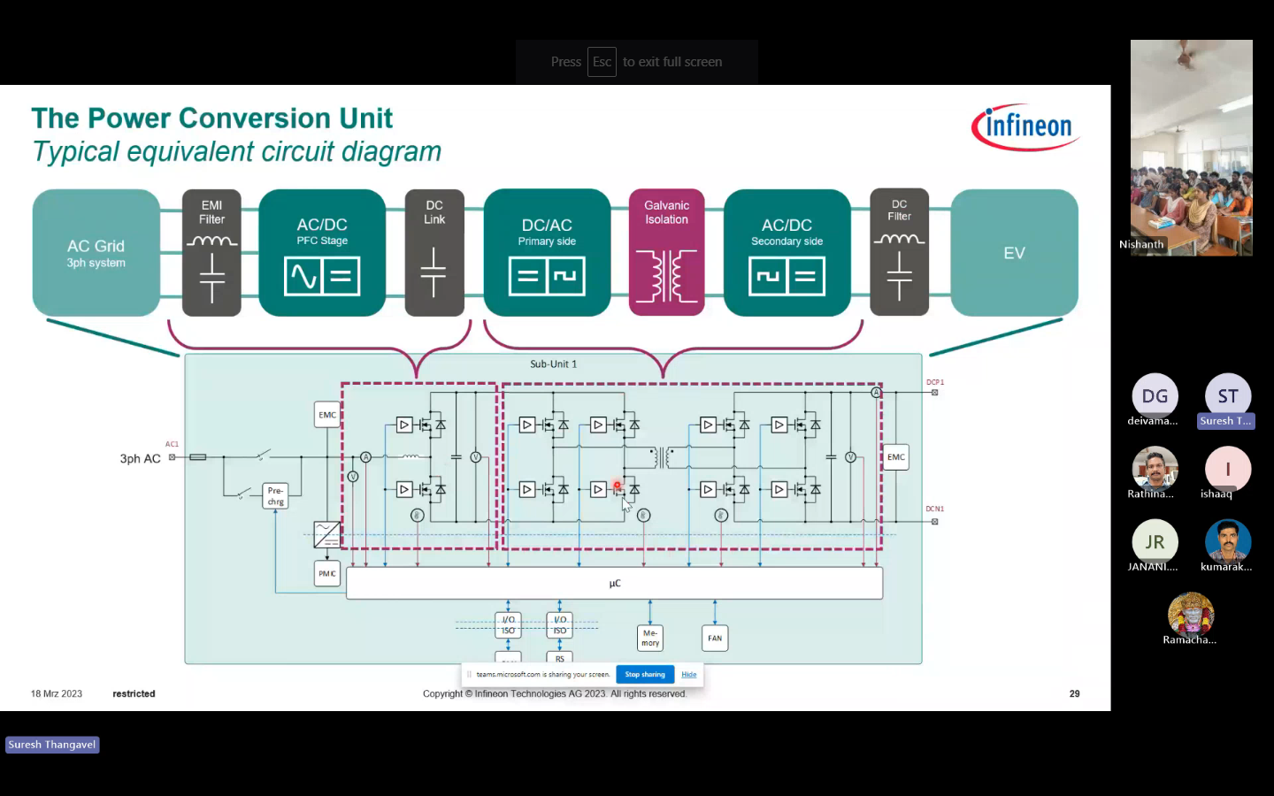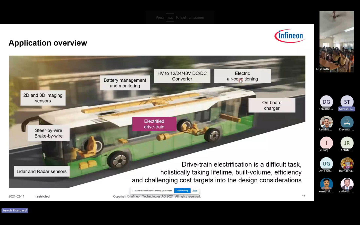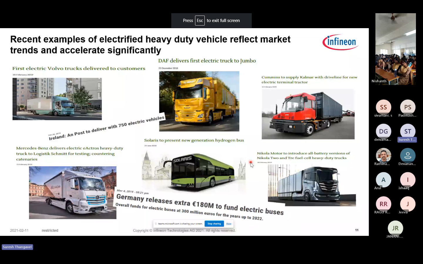 The resource person discussed Infineon’s focus on various markets, including commercial, construction, and agriculture vehicles (CAVs), as well as electrification, safety & ADAS, and connectivity & security. They also covered megatrends in these markets, compared battery electric vehicle (BEV) trucks with passenger cars, provided examples of recent electrified heavy-duty vehicles reflecting market trends, discussed use cases for CAVs, and explained how to recharge an eTruck and eBus. Additionally, they covered the complete EV charging ecosystem from AC to high-power DC, provided an application overview, and discussed a generic eTruck/eBus HV architecture with various applications featuring high potential semiconductor content. They also discussed application requirements and compared Prime PACKTM3+IGBT5/.XT joining with Prime PACKTM3 IGBT4 with standard joining.They further discussed EV charging solutions, including the power conversion subunit and the typical equivalent circuit diagram of the power conversion unit. They explained what sets SIC MOSFETs apart from IGBTs, compared the efficiency simulation of typical PFC topologies, and discussed the potential impact of fuel cell vehicles rising.