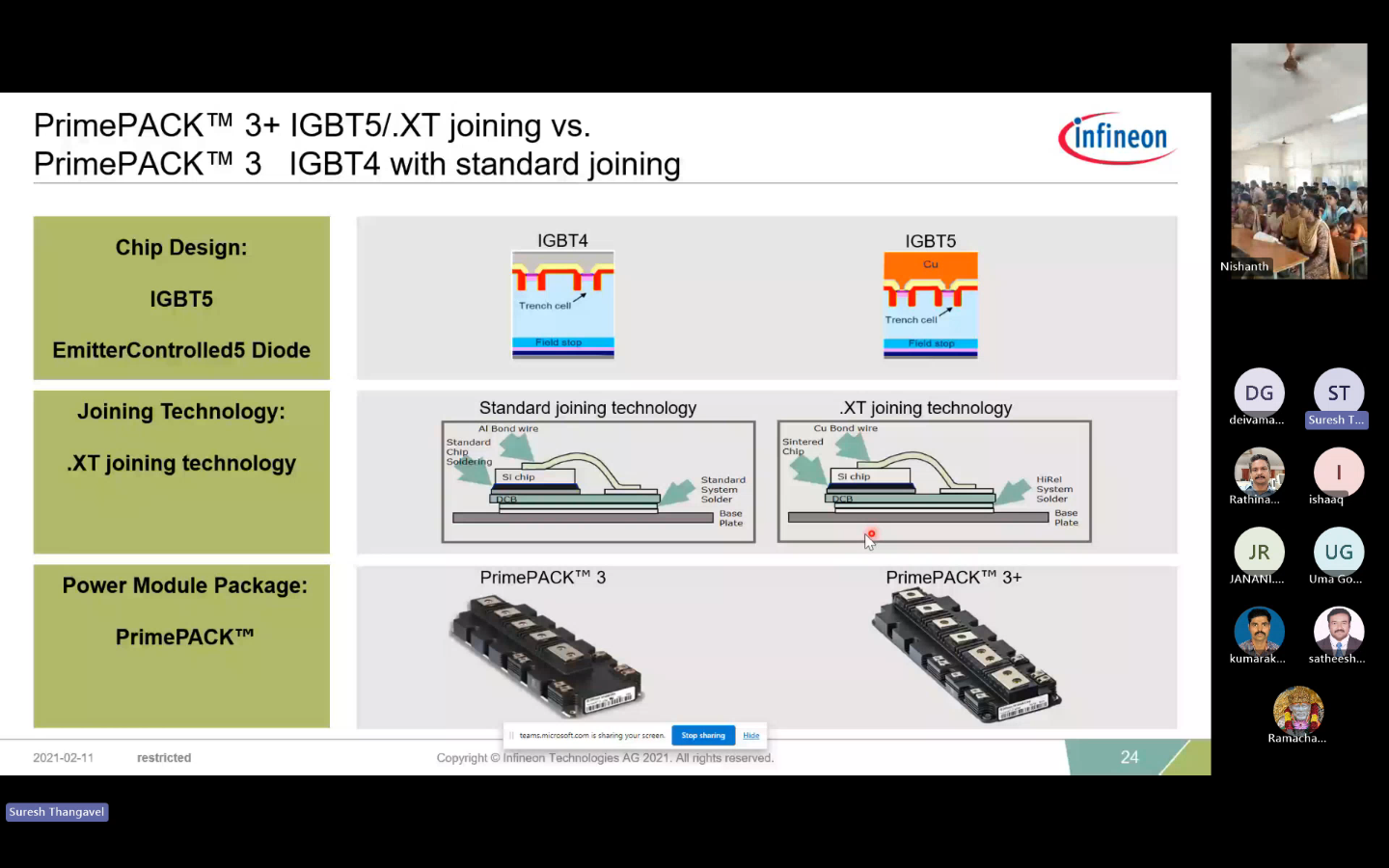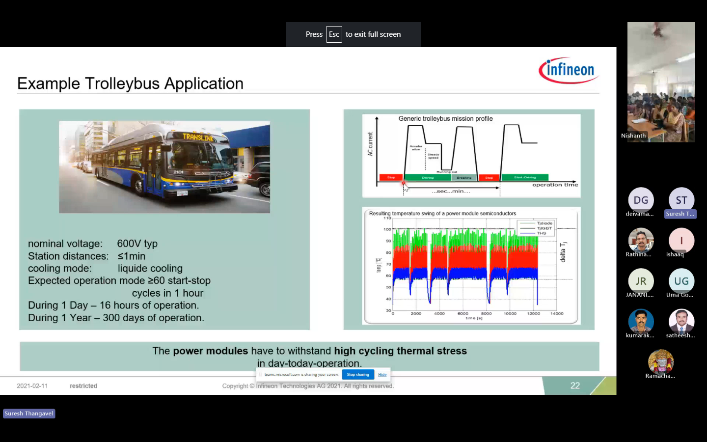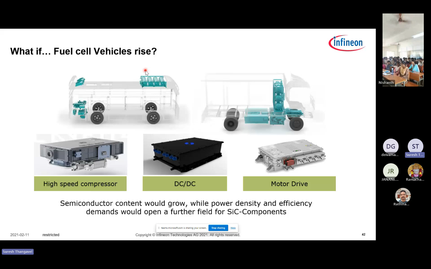 The resource person discussed Infineon’s focus on various markets, including commercial, construction, and agriculture vehicles (CAVs), as well as electrification, safety & ADAS, and connectivity & security. They also covered megatrends in these markets, compared battery electric vehicle (BEV) trucks with passenger cars, provided examples of recent electrified heavy-duty vehicles reflecting market trends, discussed use cases for CAVs, and explained how to recharge an eTruck and eBus. Additionally, they covered the complete EV charging ecosystem from AC to high-power DC, provided an application overview, and discussed a generic eTruck/eBus HV architecture with various applications featuring high potential semiconductor content. They also discussed application requirements and compared Prime PACKTM3+IGBT5/.XT joining with Prime PACKTM3 IGBT4 with standard joining.They further discussed EV charging solutions, including the power conversion subunit and the typical equivalent circuit diagram of the power conversion unit. They explained what sets SIC MOSFETs apart from IGBTs, compared the efficiency simulation of typical PFC topologies, and discussed the potential impact of fuel cell vehicles rising.