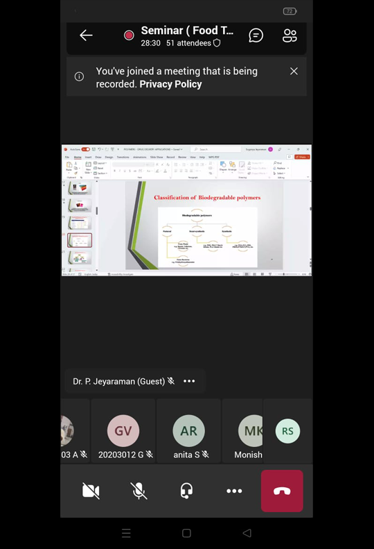 Department of Food Technology in association with Paavai Engineering college organized a seminar on “FOOD BASED BIO POLYMERS IN DRUG DELIVERY APPLICATION” on 27.08.2023 (Sunday) for third and final year students of food technology department. The resources person of the day Dr P Jayaraman illuminated the students about the Food based Bio polymers and drug delivery applications due to their biodegradability, biocompatibility, and potential for controlled drug release He insisted the properties of polymers with respect to metals and ceramics. He also gave a brief explanation on the application of polymers in the food industries and evolution of polymers in medical appliances. He also entitled the essence of drug delivery system. The students raised queries about the role of edible plastics and their future modules in Food Packaging Industry.