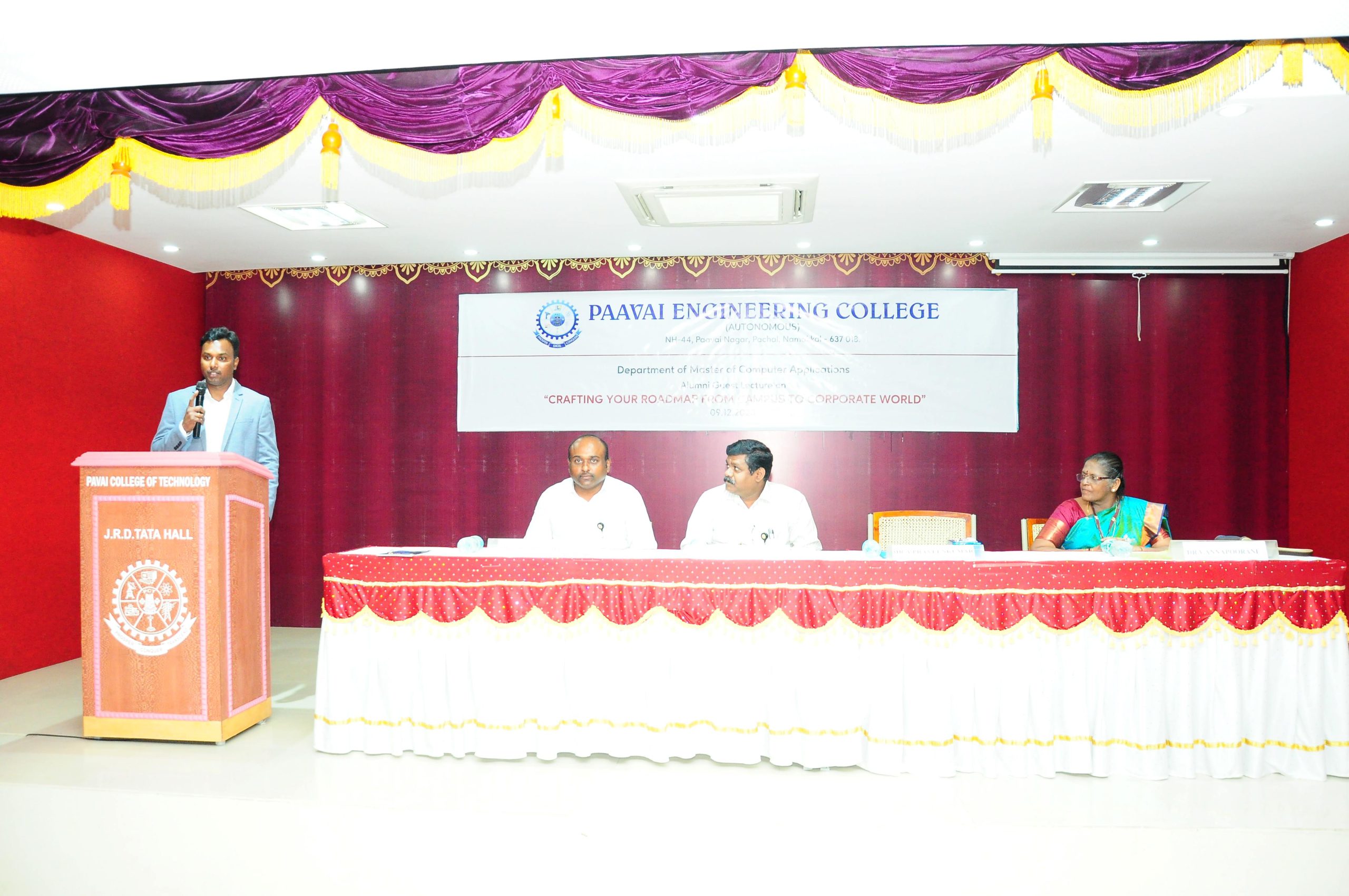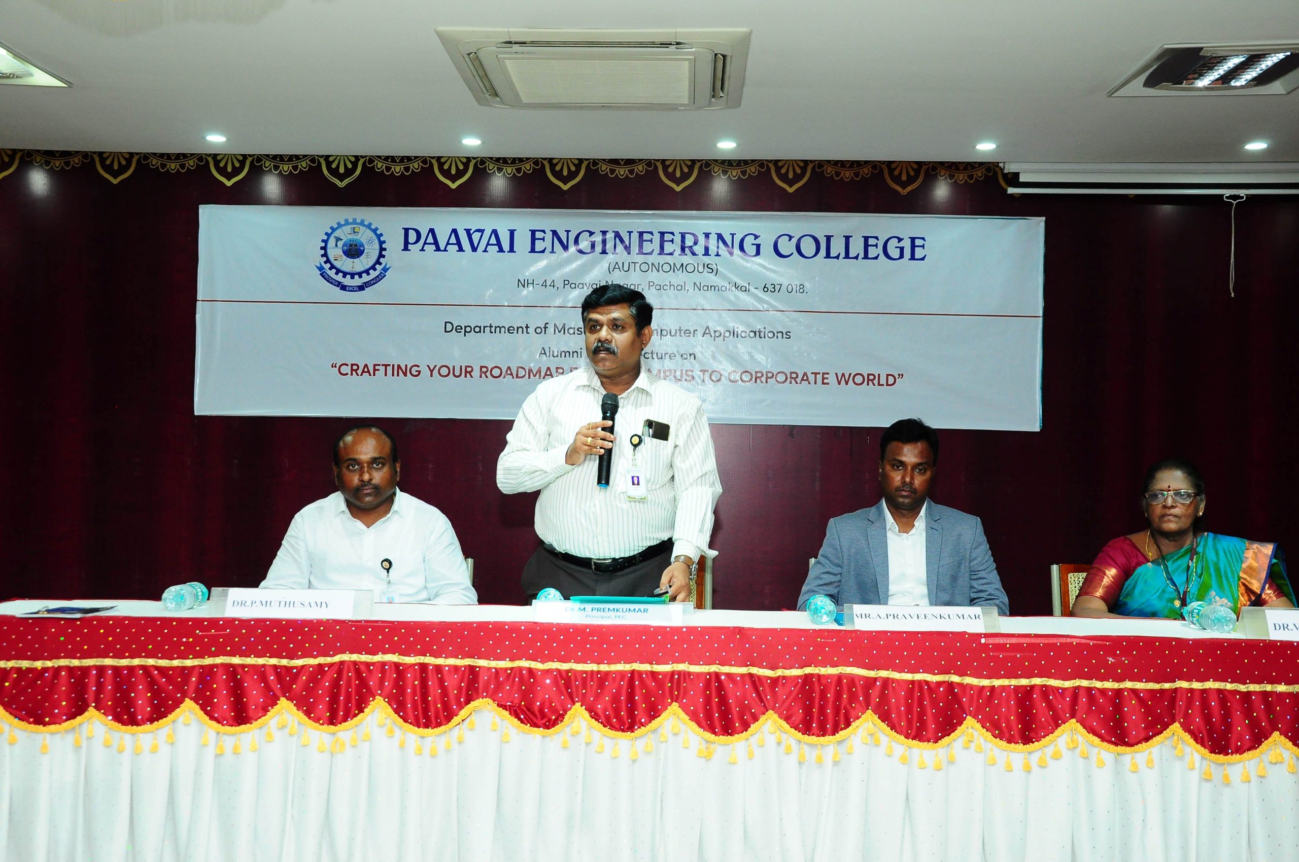 The department of MCA had organized a one day Alumni Guest Lecture Series on “Crafting Your Roadmap from Campus to Corporate Word” on 09th December 2023. Mr. A. Praveenkumar, Technical Project Manager, Tata Consultancy Services, Bengauru, was the Alumni Speaker at the function. The function started with a divine note along with a prayer song. Ms. S. Keerthi, I-Year MCA, welcomed the gathering. The function was presided over by Dr. M. Premkumar, Principal, Paavai Engineering College and the alumni speaker was introduced by Ms. R. Seva Varshini, I-Year MCA.
