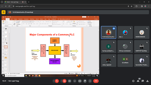 The department of Mechatronics Engineering organized a one-day workshop through online titled on “INDUSTRIAL AUTOMATION –PLC&SCADA” on 07th March 2024.Dr.M.Sabarimuthu, Assistant Professor, Kongu Engineering College, Perundurai was the guest speaker. He explained the workshop aimed to provide participants with a better understanding the aspiring engineers acquainted with the conceptual as well as practical knowledge of the Industrial Automation & latest technologies being used to achieve industrial automation.