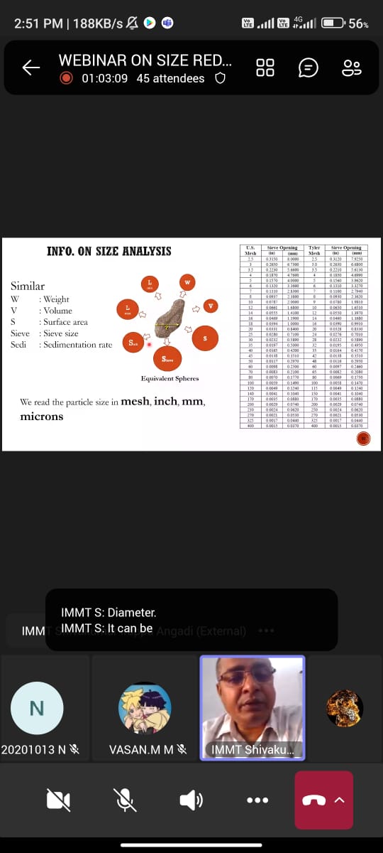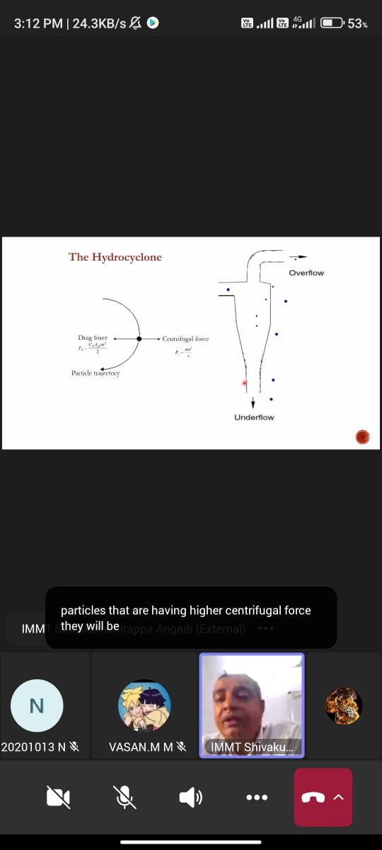 The resource person briefed about the size reduction mechanism and equipments used for size reduction process. He explained about the application of separation techniques in industrial process. The speaker shares about various unit operation involved such as ball milling, particle breakage , Screening, jaw crusher, Magnetic separation, gravity concentrator , hydro cyclones, Knelson  concentrator. He felicitates the possible research and development activities in CSIR research centre. The students interacted with the guest speaker with their queries and illuminated themselves .The webinar ended with vote of thanks by Selvan.M.Vasan from Second year Chemical Engineering department.