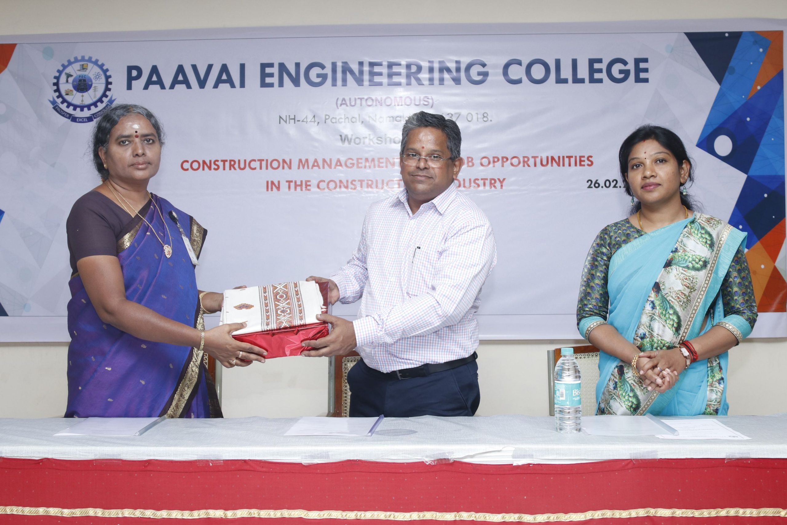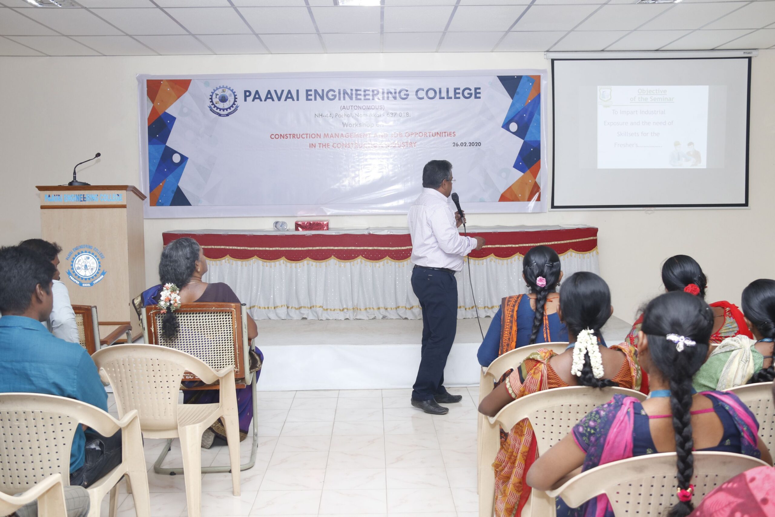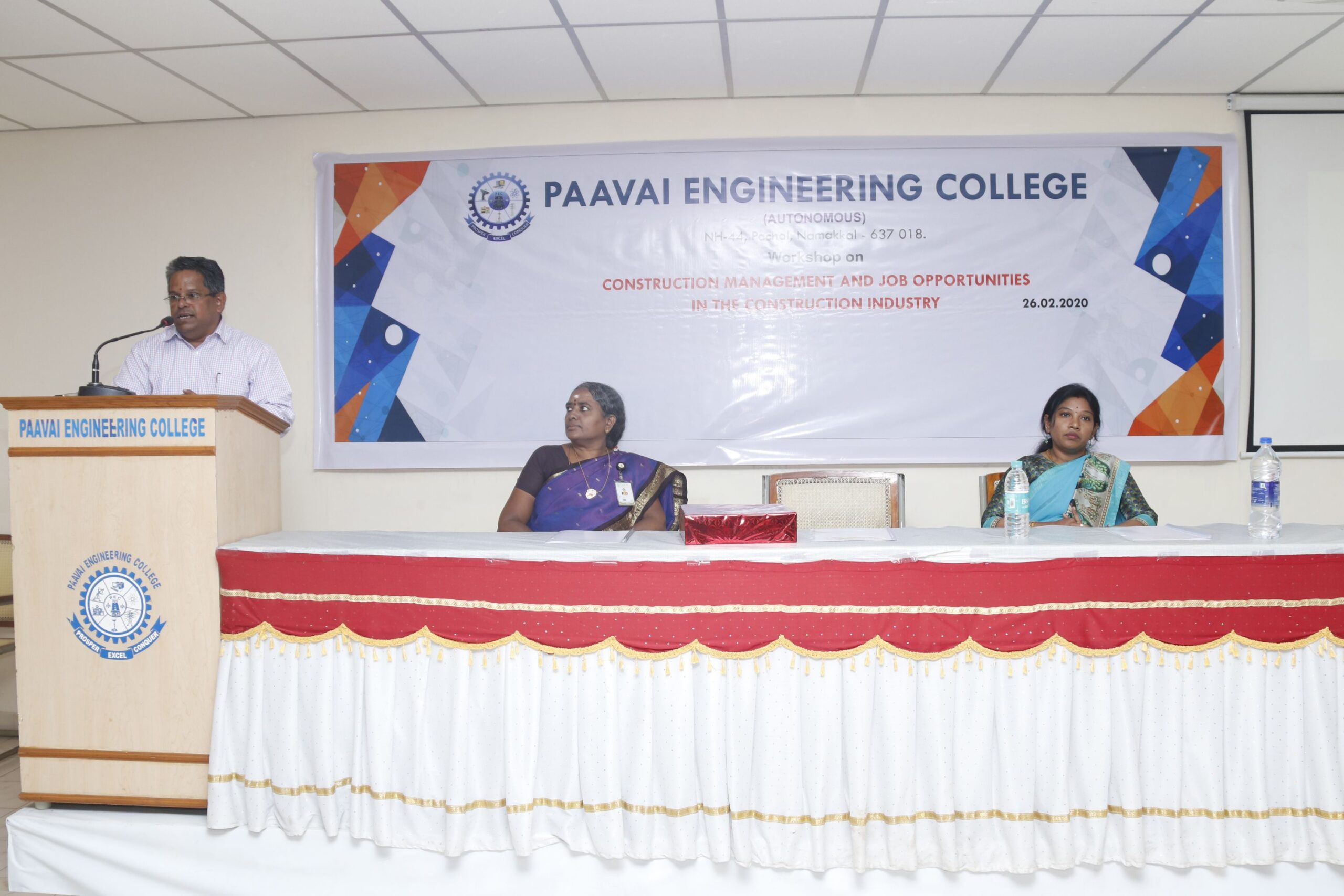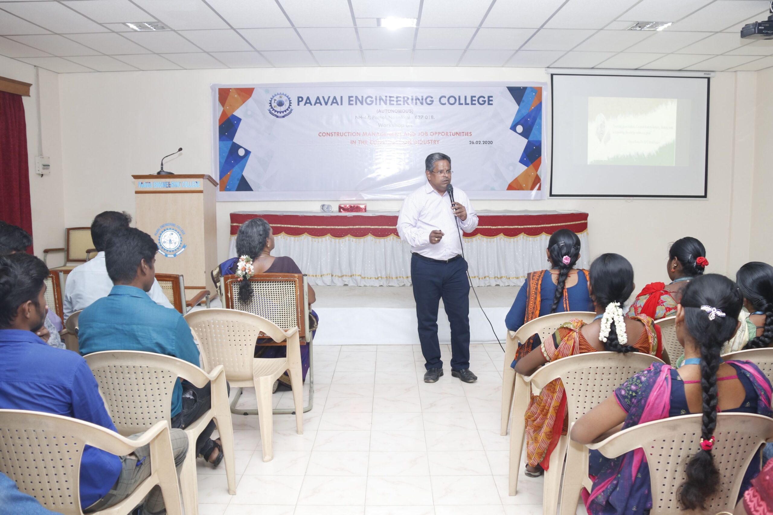 Workshop On “ CONSTRUCTION MANAGEMENT AND JOB OPPORTUNITIES IN THE CONSTRUCTION INDUSTRY’. A one day workshop on the title “CONSTRUCTION MANAGEMENT AND JOB OPPORTUNITIES IN THE CONSTRUCTION INDUSTRY’ was organized on 26.02.2020 by the Department of Civil Engineering,Paavai Engineering College at Cute Hall. Er.V.Srinivasan ,Founder and CEO prayojana Engineering services ,prayajana infratech solutions –salem was the chief guest of the day Ms.SU.SUSHMA,Second year student welcomed the gathering and Ms.Sasikala Final year student gave a brief introduction about the chief guest. Through this workshop Students gained knowledge in project planning and execution ,contract management and overall project management .The workshop provided an idea on Quality control system implementation and design coordination. Ms.Divya Prabha,Final year student delivered Vote of thanks.