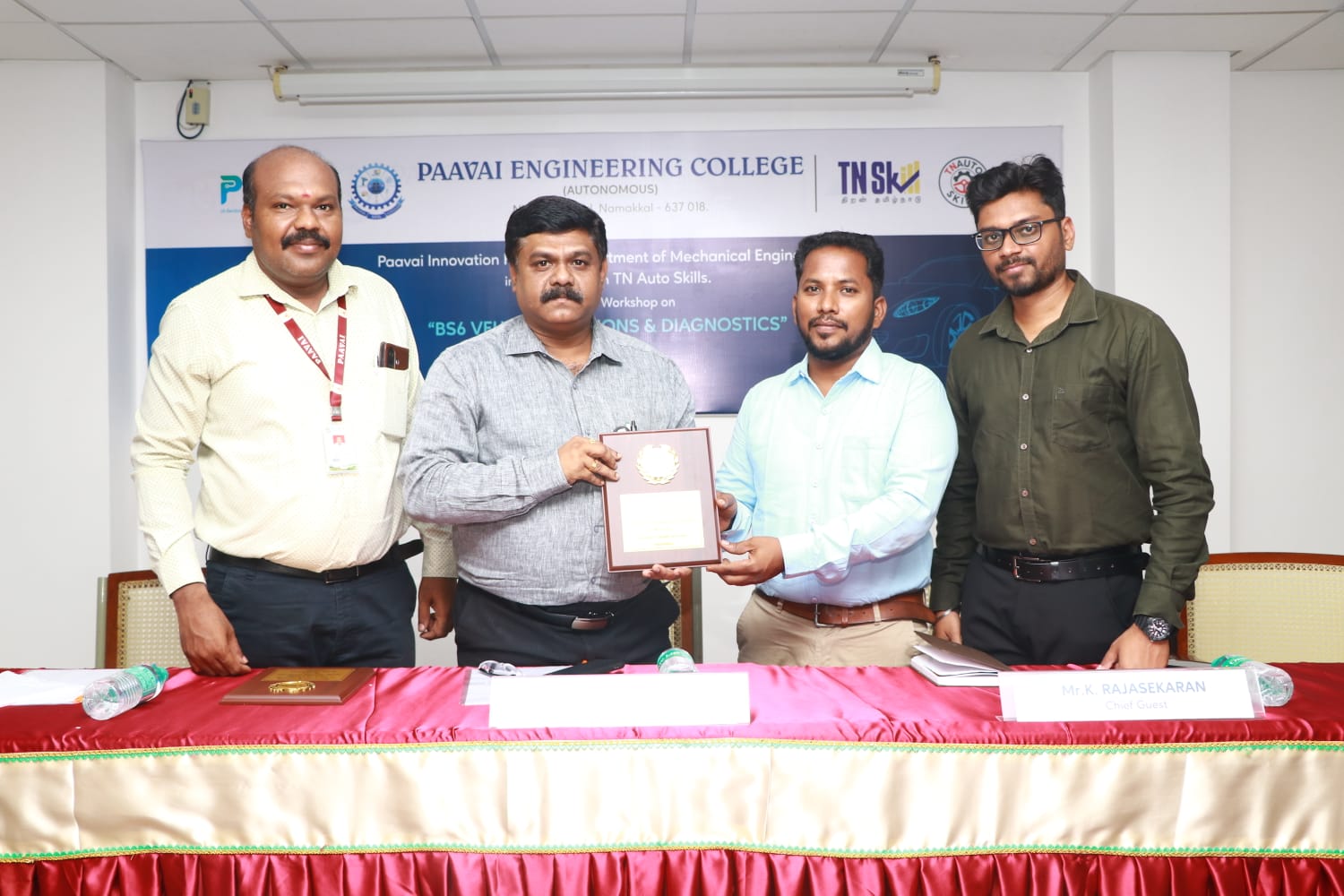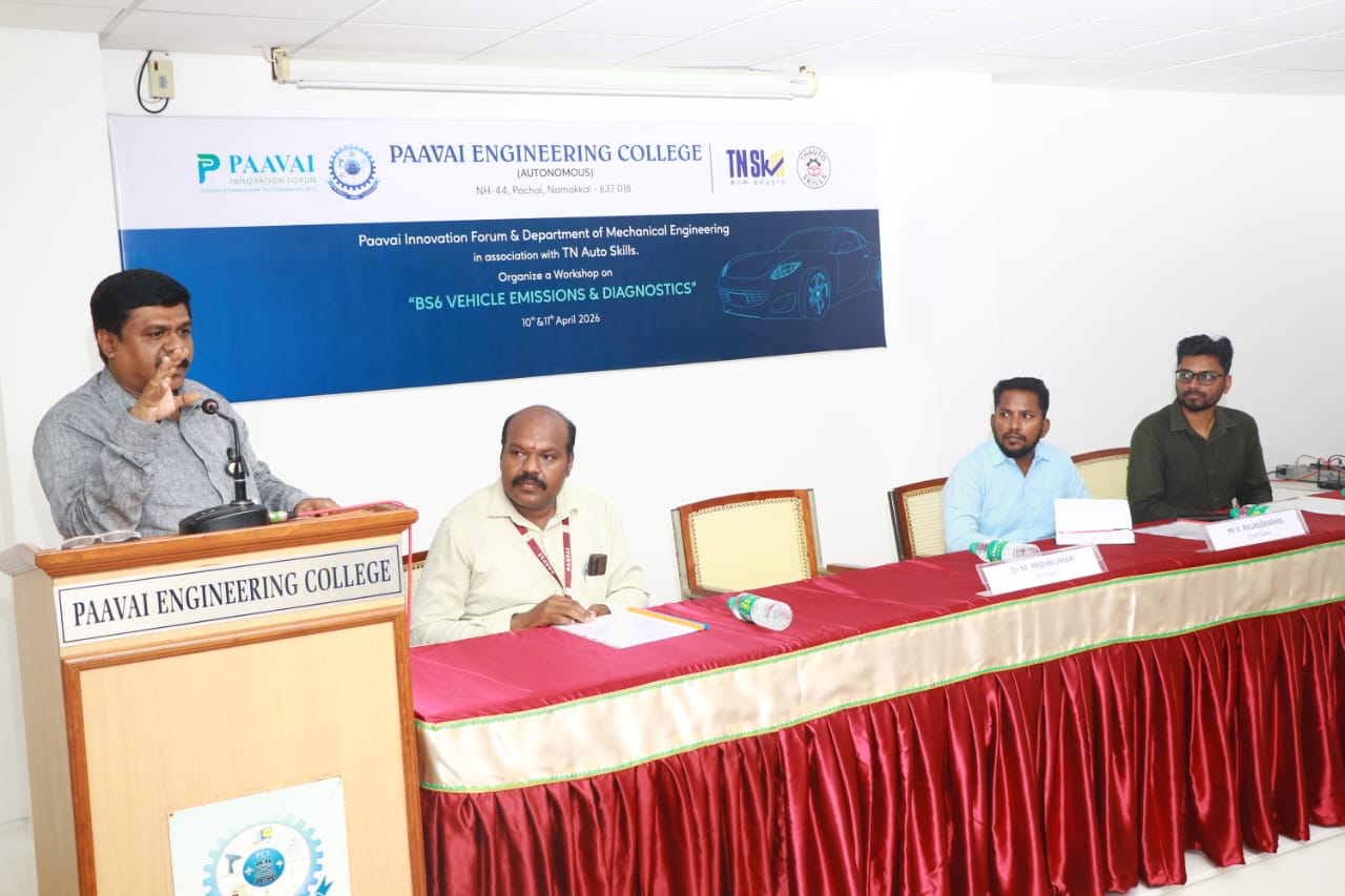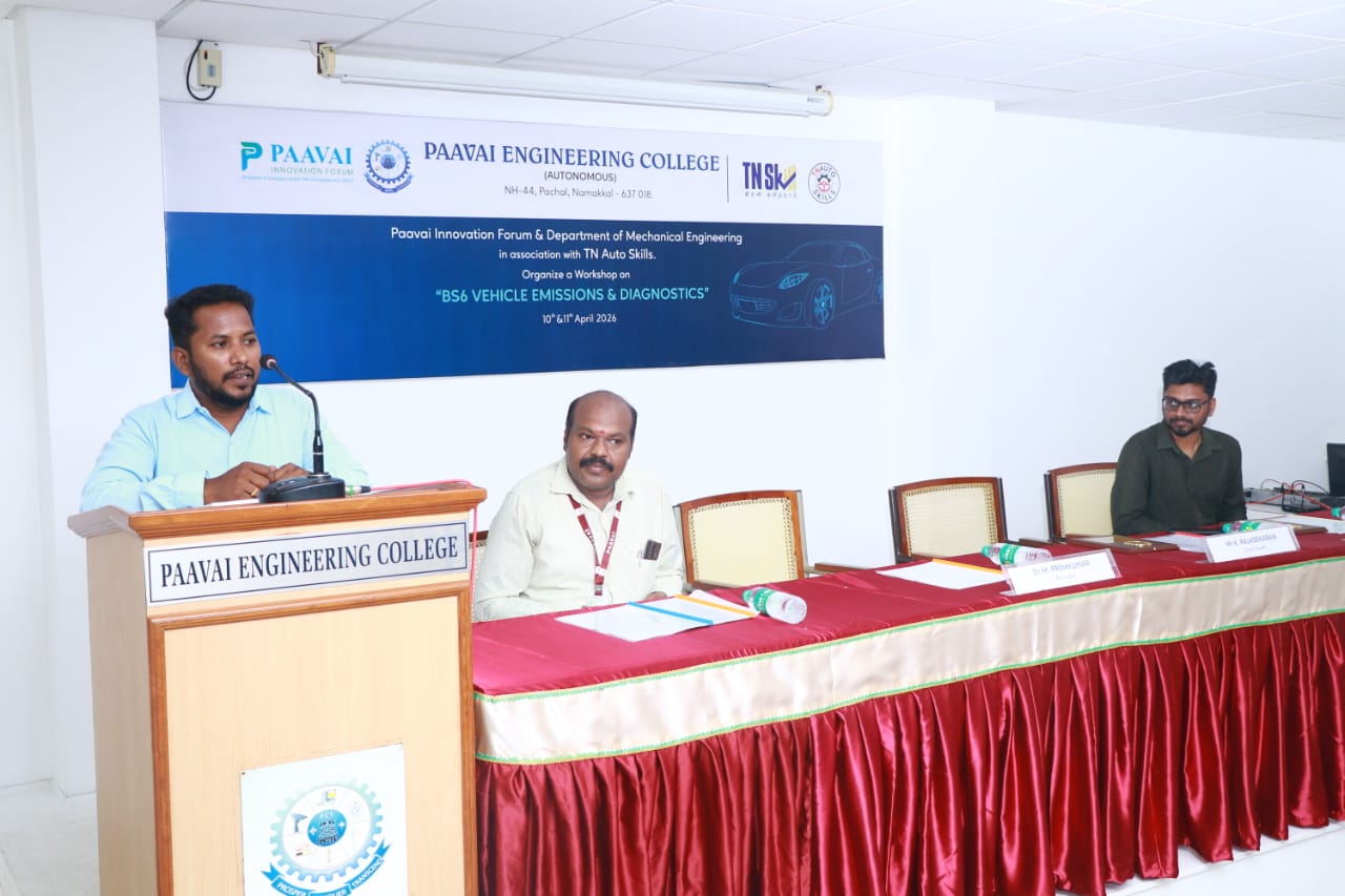 The Department of Mechanical Engineering at Paavai Engineering College successfully organized a two-day hands-on workshop on “BS6 Vehicle Emissions & Diagnostics” in association with the Tamil Nadu Apex Skill Development Centre for Automobile (TN AutoSkills) on 10th & 11th April 2026 at Bright Hall.