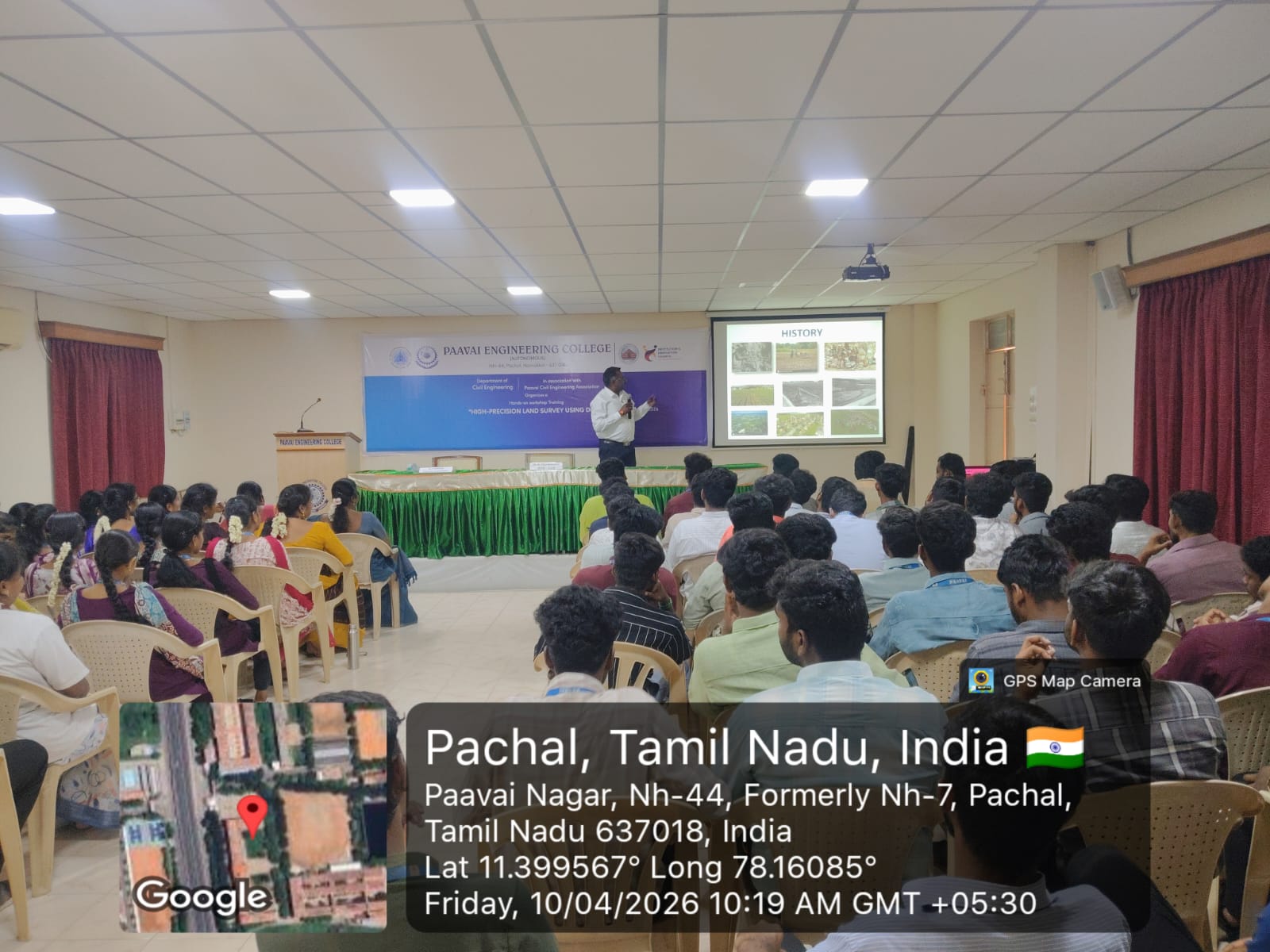 One-day Hands-on workshop Training in the title “High -Precision Land Survey using DGPS” was organized by the Department of Civil Engineering jointly with Paavai Civil Engineering Association, Paavai Engineering College (Autonomous) on 10.04.2026. Ms.S.Aarthikumari, Second year student welcomed the gathering. Dr.M.Premkumar, Principal, Paavai Engineering College delivered his presidential address on this event, he addresses the opportunities available for civil Engineers in the world wide.