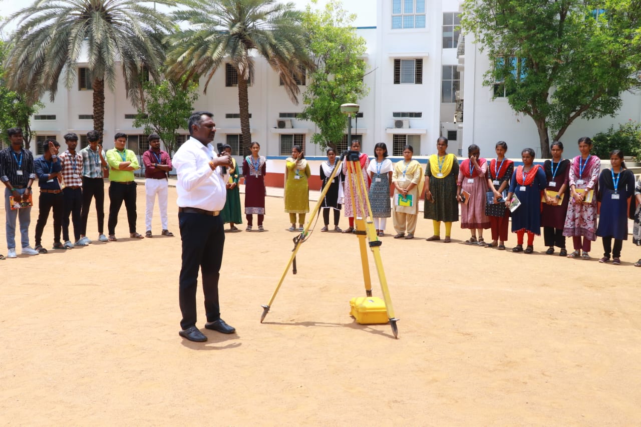 Ms.R.Priyadharshini, Third year student introduced the speaker. Dr.J.Sankar ME.,(Stru).,Ph.D.,L.L.B., Registered Engineer & Approved Valuer, Proprietor, Surrya Builders, Salem was the resource speaker. He briefed about the applications and advantages of DGPS instruments along with the preliminary adjustments. Also, his team members elaborated how to take readings in the DGPS instrument. They also elaborated the Do’s and Dont’s in the surveying instruments.