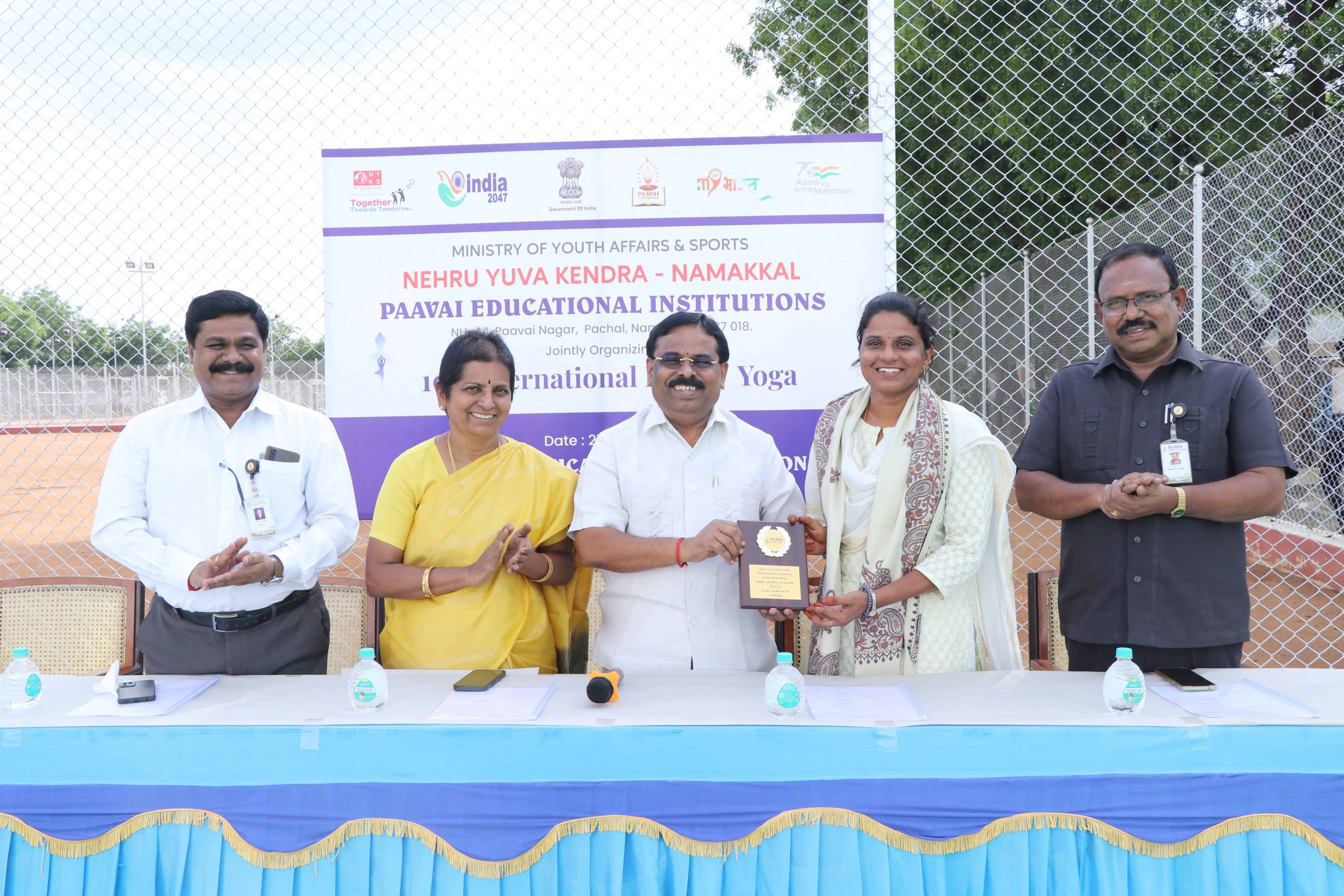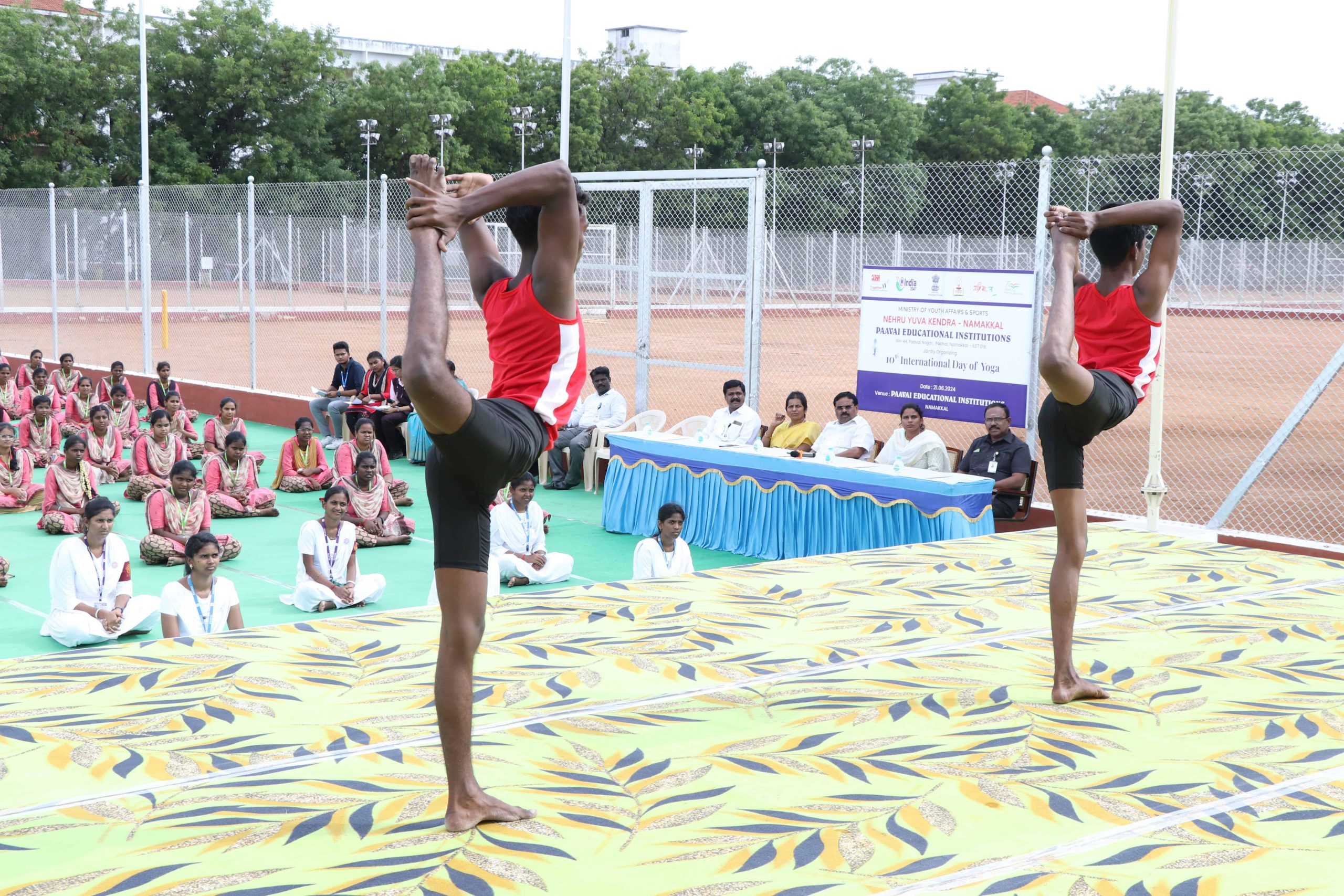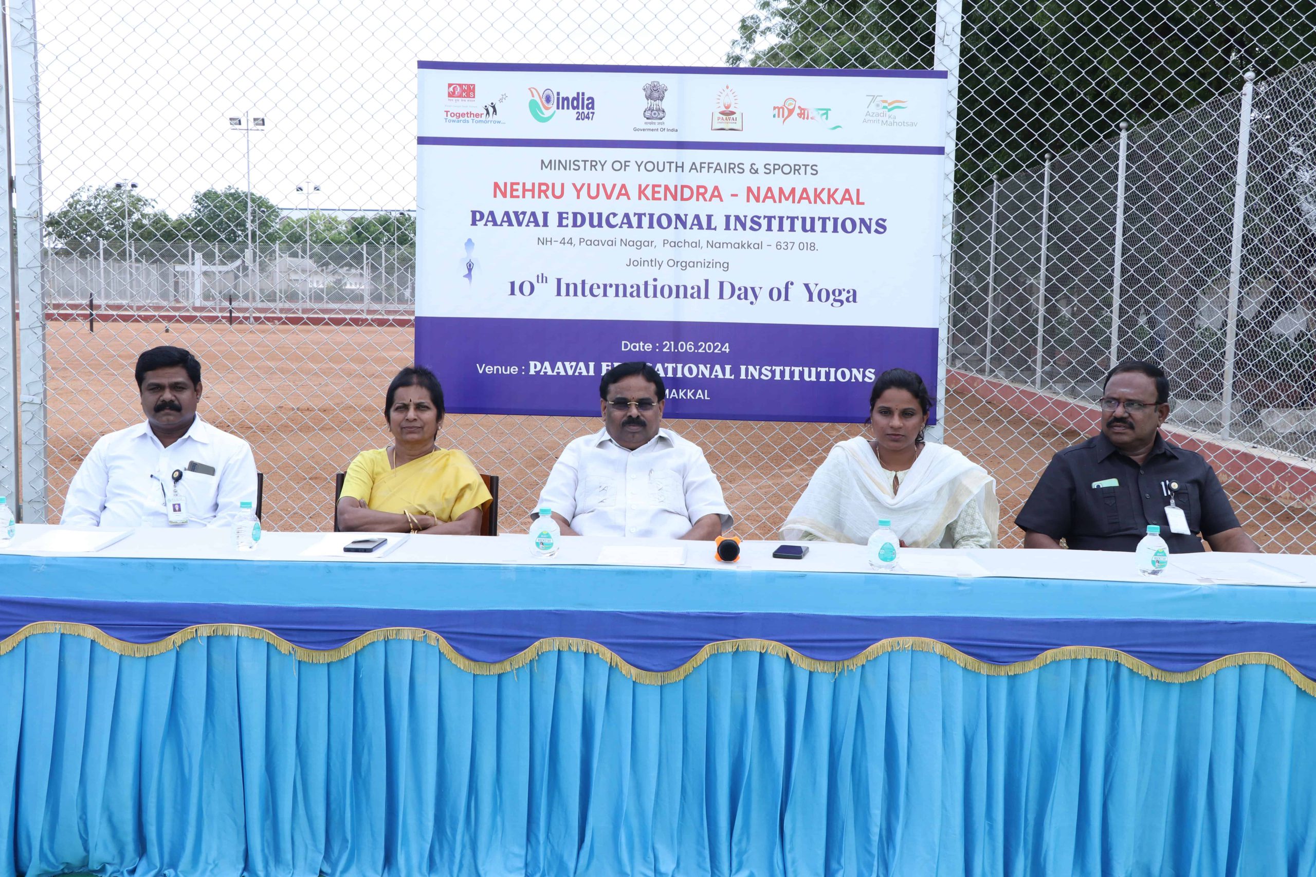 Paavai Educational Institutions celebrated the “International Yoga Day 24” on 21.06.2024 at Arjun Sports Maidan, to recognize Yoga’s role in promoting peace and harmony as it unites people globally to embrace wellness. The programme commenced with a welcome address by Mr.B.Sasidhar, First year, Food Technology student. Shri.CA.N.V.Natarajan, Chairman, Paavai Educational Institutions presided over the function. Smt.Mangai Natarajan, Correspondent, Paavai Educational Institutions graced the yoga day celebration. Ms.S.Keerthana, District Youth Officer, Nehru Yuva Kendra, Namakkal was the chief guest. She insisted on “A Sound Mind in a Sound Body” and emphasized that mental well-being is best achieved and maintained through physical health. She also added that Yoga is a simple yet excellent practice that should be incorporated into our daily routines, not just on special occasions.
