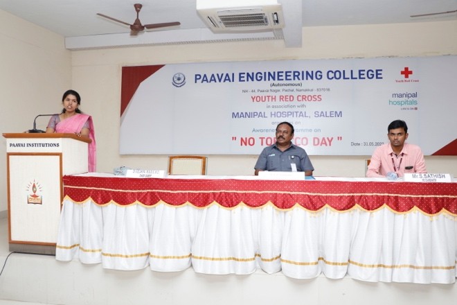 The Youth Red Cross of Paavai Engineering College in association with Manipal hospitals, Salem had organized an Awareness programme on “No Tobacco Day” on 31st May 2022 in Prestige Hall between 3.00 p.m to 4.00 p.m. Dr.A.Elakya M.B.B.S, M.D.,Manipal hospitals was the Chief guest. The inauguration started with the prayer song. The welcome address was given by B.Dharani from II year Electronics and Communication Engineering. Dr.K.K.Ramaswamy, Director Administration gave the presidential address and explained the awareness about the effects of tobacco consumption.